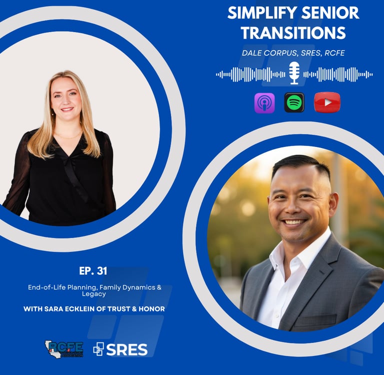 In a recent episode of the Simplify Senior Transitions Podcast, host Dale Corpus, a senior transition specialist and real estate expert, sat down with Sara Ecklein, a licensed professional fiduciary and founder of Trust & Honor. Sara's work is essential for families facing the complicated transactions that come with health, aging, and legacy. She brings a unique, mindful, and heart-centered approach to her practice, rooted in her experience in hospice and end-of-life care. Her insights offer a beacon of hope and practical guidance for your family's journey.