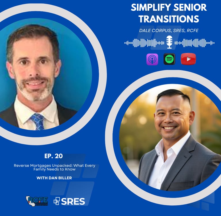 In a recent episode, "Reverse Mortgages Unpacked: What Every Family Needs to Know," we were joined by Dan Biller, a reverse mortgage specialist with New American Funding. Dan's insights are invaluable for families like ours in the San Francisco Bay Area (including Contra Costa, Alameda, Santa Clara, San Mateo, San Francisco, Solano, and Napa counties) because he brings years of experience helping seniors and their families understand how reverse mortgages work, who qualifies, what the risks are, and how to use this option responsibly.